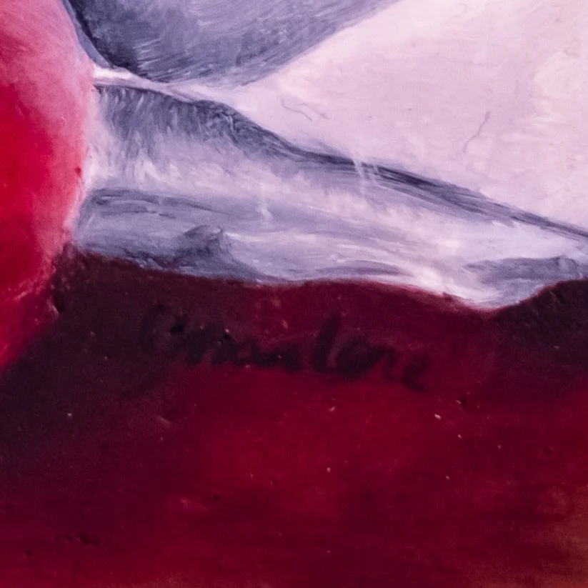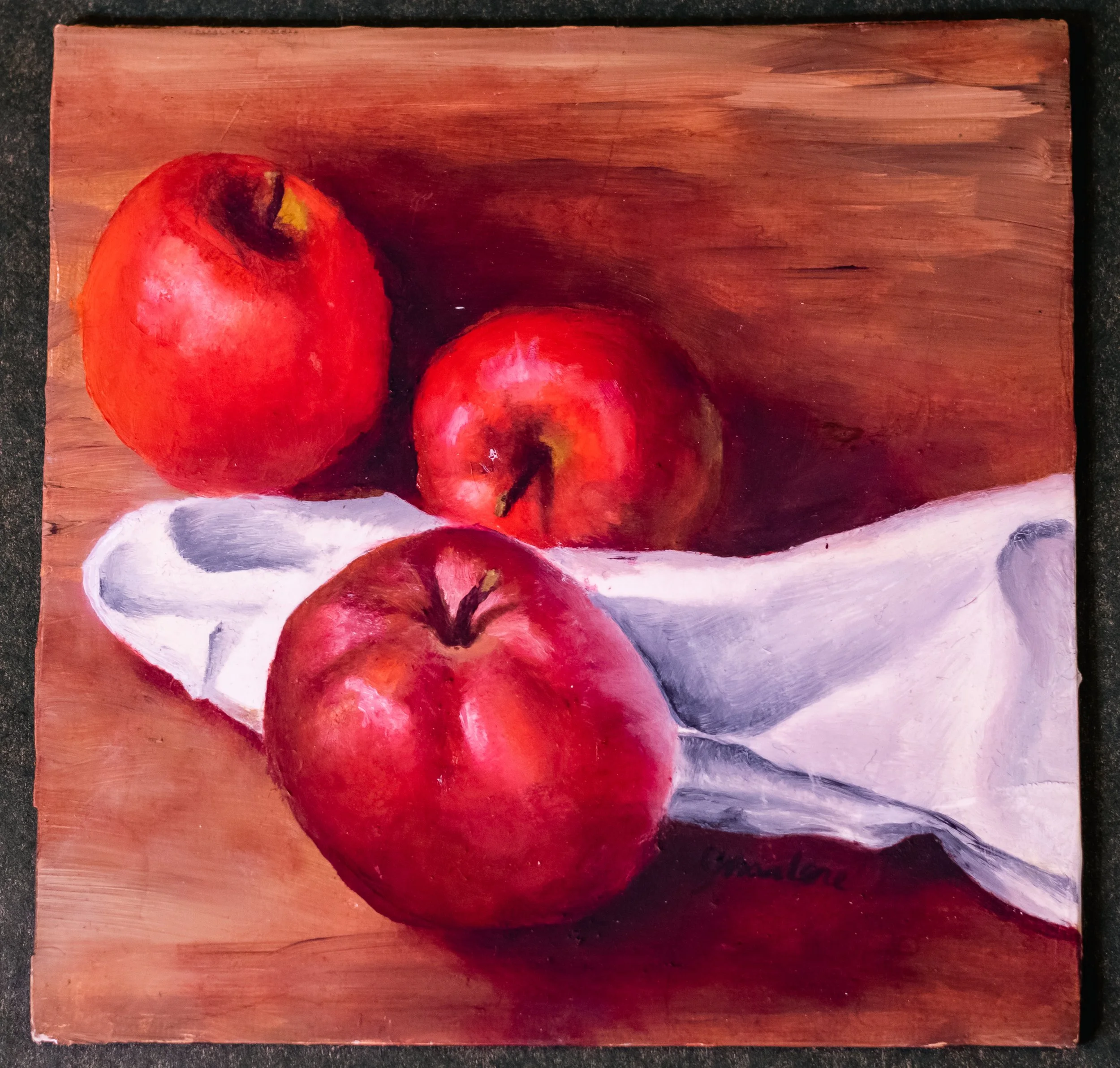 Let this painting remind you of those summer days that ask for nothing but your presence. It speaks of the times when you've stumbled upon a patch of shade and allowed yourself the grace of a pause, to admire the stark redness of apples, and in doing so, finding an anchor in the present.