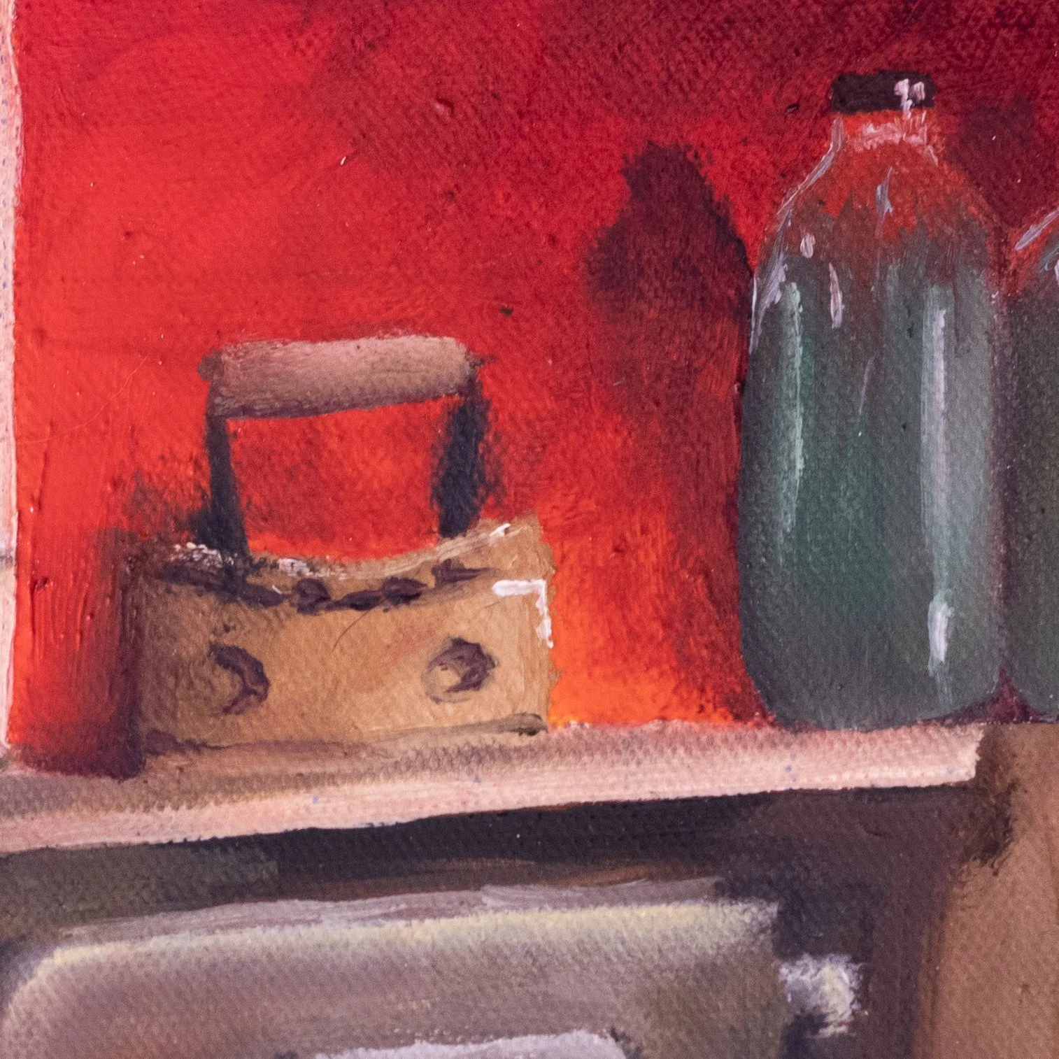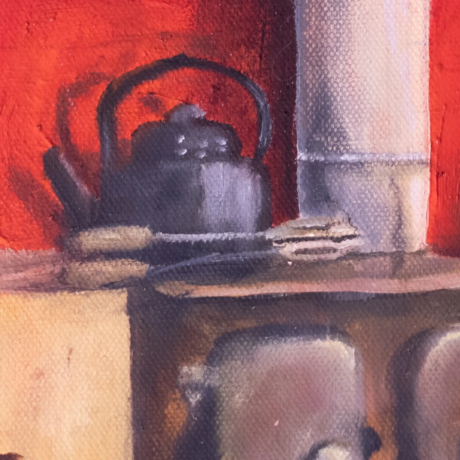 In the foreground, the countertop glows like a golden pathway, leading to the heart of comfort as the room awaits the hands that will turn the stove's knobs, lift the kettle, and pour out steaming cups of solace. With each stroke of the brush, I captured not just a scene, but a sensory experience—the heat radiating from the stove, the aroma of tea leaves unfurling, the sizzling sound of a day coming to life.